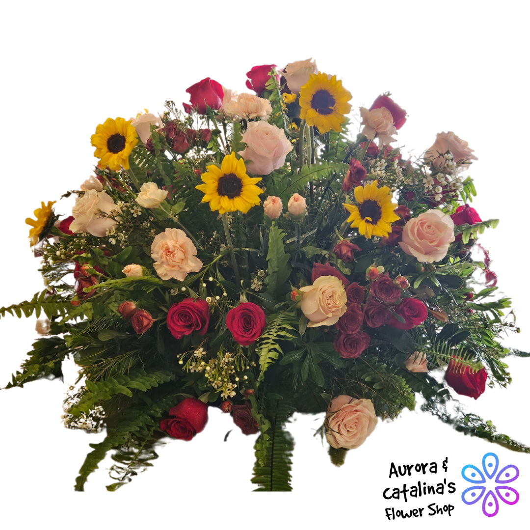 Arreglo: 48 Rosas, mini Rosas, girasol, claveles, helecho, clavo, aster Base: Plástico